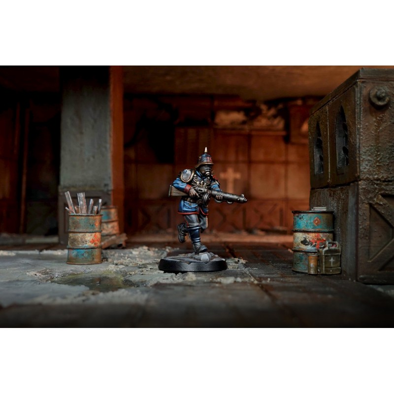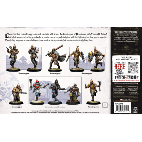 This box contains five finely detailed miniatures, offering a wide range of assembly options thanks to multiple heads, weapons, and equipment choices. The miniatures are supplied unpainted and may require some assembly, giving hobbyists the opportunity to customize each model to their liking. Printed materials are provided in English. This set is an excellent addition to any Prussian force, delivering a versatile assault unit that is both visually striking and tactically effective on the tabletop.