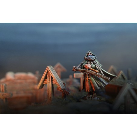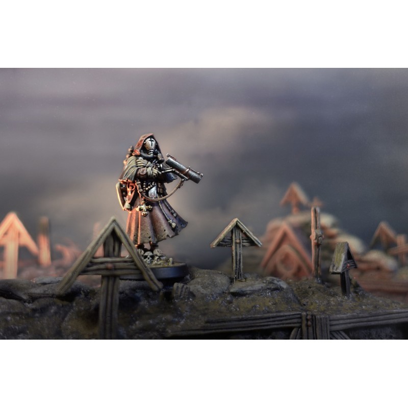 The sniper priests of New Antioch are the undisputed masters of long-range combat. Both mystics and seasoned warriors, they follow a doctrine unlike any other on the battlefield. Through a ritual act of self-blinding, they deliberately cast aside doubt and hesitation, choosing to rely solely on their faith in God to guide their aim. This extreme devotion transforms every shot into an act of belief, granting them an unmatched level of precision despite their apparent lack of sight.