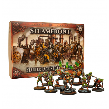 This Steamwoken faction starter set is an excellent way to begin your Steamfront experience. The box includes 9 high-strength resin 3D-printed miniatures, along with 9 textured bases. It also provides the full rules, profile cards, and all necessary tokens and dice to start playing straight away. The Steamwoken force consists of 1 Coordinator, 2 Hammerers, 3 Whisperers, and 3 Assemblers, offering a playstyle focused on synergy, relentless pressure, and precise steam management.