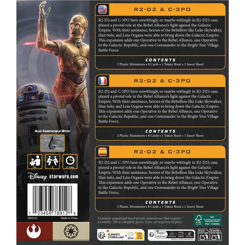 R2-D2 and C-3PO play, sometimes unintentionally, a central role in the conflict between the Rebellion and the Empire. Their ingenuity, loyalty, and constant presence alongside legendary heroes allow Luke Skywalker, Leia Organa, and Han Solo to carry out missions that ultimately bring down the Galactic Empire. This expansion lets you add these iconic droids to your games, bringing strong narrative flavor and unique tactical options to your battles.