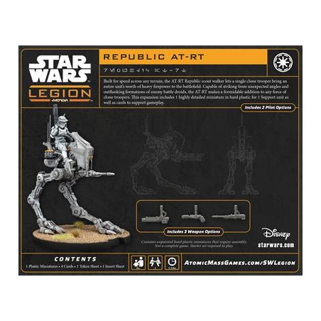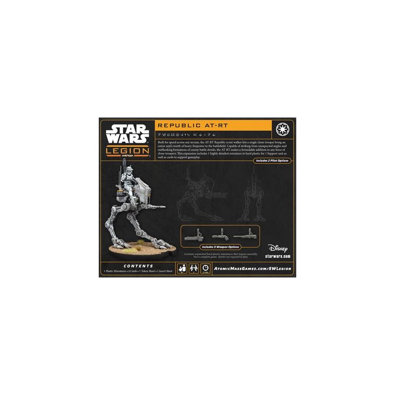 This expansion for Star Wars™: Legion introduces the Republic AT-RT scout walker. This light vehicle allows a single clone trooper to bring the firepower of an entire unit onto the battlefield. Fast, mobile, and highly effective, it fits seamlessly into Republic armies and becomes a key strategic asset for strengthening your clone forces during your games.