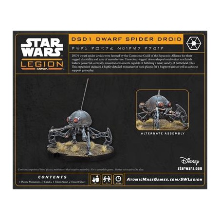 This Star Wars™: Legion expansion introduces the DSD1 dwarf spider droid, a unit highly valued by the Trade Federation of the Separatist Alliance for its durability and ease of production. These dome-shaped quadrupedal mechanical spiders combine mobility and firepower, enabling them to perform a wide variety of missions on the battlefield. They provide your army with a formidable presence capable of challenging numerous threats.