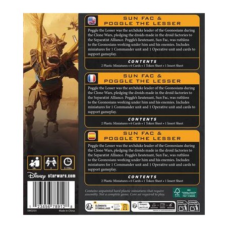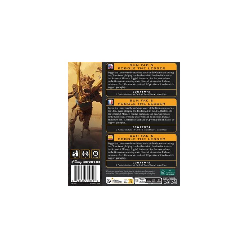 In addition to the miniatures, this expansion includes the Command cards for Poggle the Lesser and Sun Fac, allowing you to deploy their abilities and adapt your tactics in every game. The miniatures come unassembled and unpainted, giving you full freedom to customize them. A Star Wars™: Legion starter set is required to play. The box contains two plastic miniatures to assemble, six cards (two Unit and four Command), one token sheet, and one rules leaflet, enriching your Separatist army with charismatic and strategically powerful leaders.