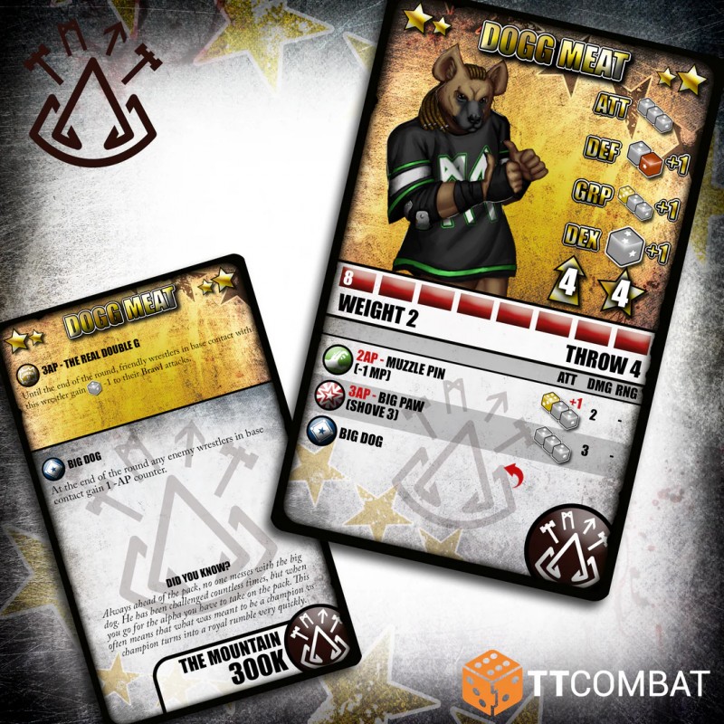 If his wrestling technique is not enough, Dogg Meat can activate his Big Paw ability, costing 3 silver coins and dealing 3 damage. This powerful attack allows him to seize the advantage at any moment and turn the tide in close matches. His combination of raw strength and tactical skill makes him a versatile opponent, capable of controlling the pace of the match and keeping his enemies on the defensive.