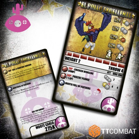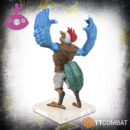 The crowd’s support for El Pollo is unmatched, and their inspiration allows him to stay longer in the fight, proving that a fighting chicken should never be underestimated. This kit includes a resin figure, a clear acrylic base, and a character card. The base comes with a colored protective film that must be removed before assembly. The figure is supplied unpainted and unassembled, requiring careful cleaning and assembly. Small gaps may need filling for a flawless finish, making this model a must-have for collectors and players seeking a bold and entertaining addition to their roster.