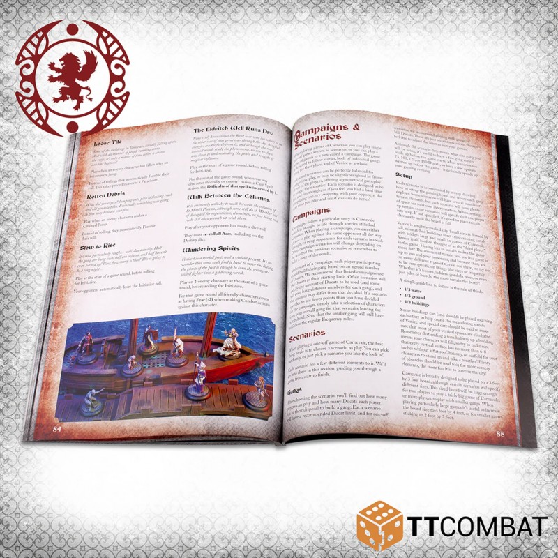 Blood on the Water is the first campaign expansion book for Carnevale. At 112 pages, it includes 15 new scenarios, a full rules update, additions for advanced players, and stunning new illustrations. New mechanics include advanced acrobatics, reactions to opponents' moves, and the use of artefacts and dark tides to enhance strategy. This softcover book provides everything players need to dive into the new era of Carnevale and experience exciting, balanced, and immersive gameplay.
