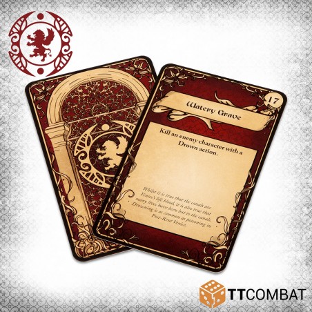 This set contains 36 cards covering all game agendas, from eliminating rival leaders to pushing enemies into the canals. Simply draw the cards and follow the instructions on the cover card to earn extra victory points and enhance your Carnevale games.