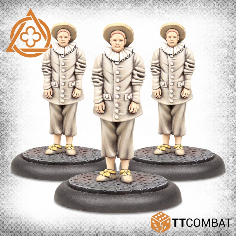 This kit includes 3 resin miniatures and 3 plastic bases, while the illustrated stone bases are sold separately. The miniatures are supplied unpainted and unassembled, requiring cleaning and assembly, with minor adjustments possibly needed to fill small gaps. Pierrot adds an unpredictable and subtle dynamic to your Carnevale games.