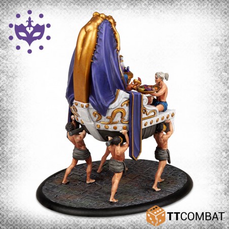 Seated on the finest padded chair atop his palanquin, the noble wears sumptuous silks and uses gold utensils, embodying the height of refinement and magnificence. He travels along the canals of Venice, tasting any dish he desires, while his entourage carries him with care. Every detail emphasizes his power and excess, making this character unforgettable and imposing.