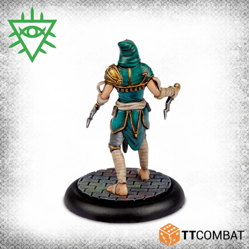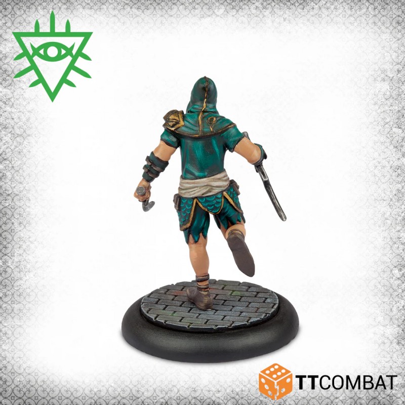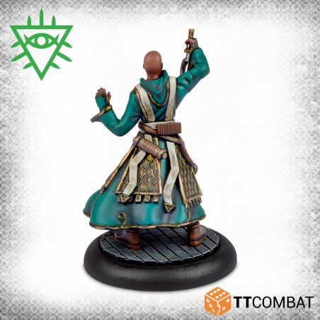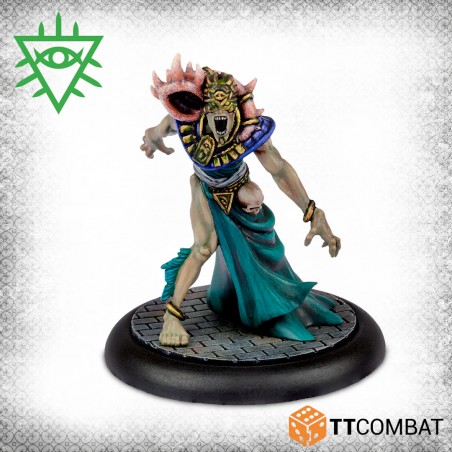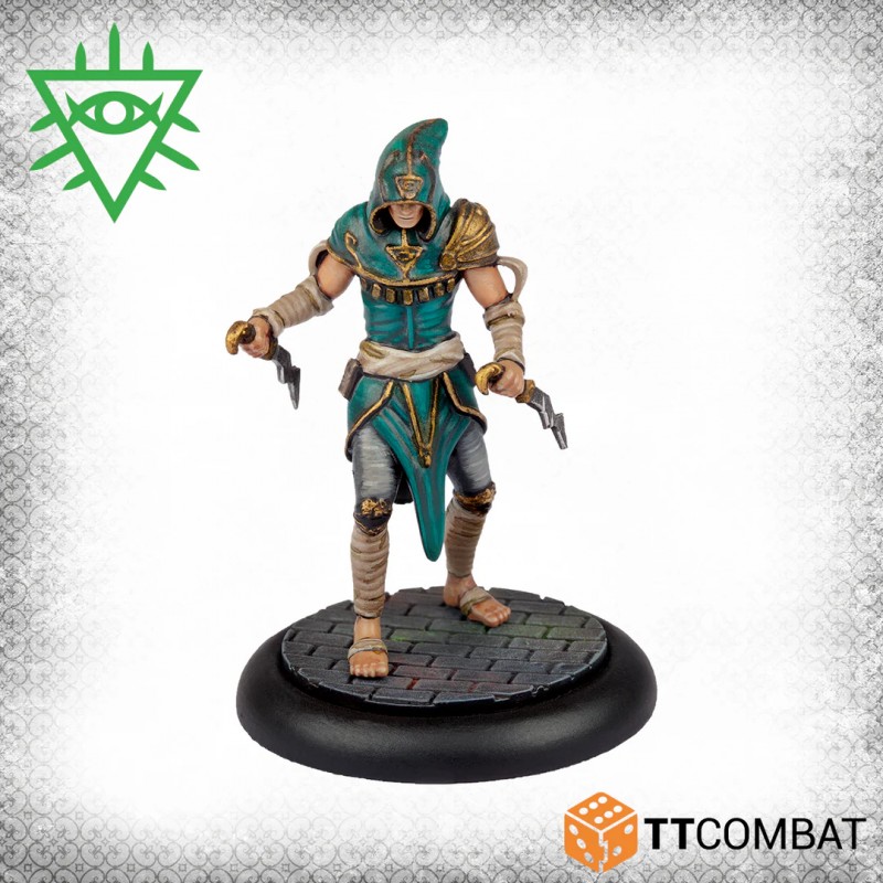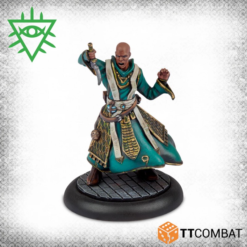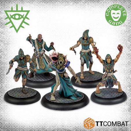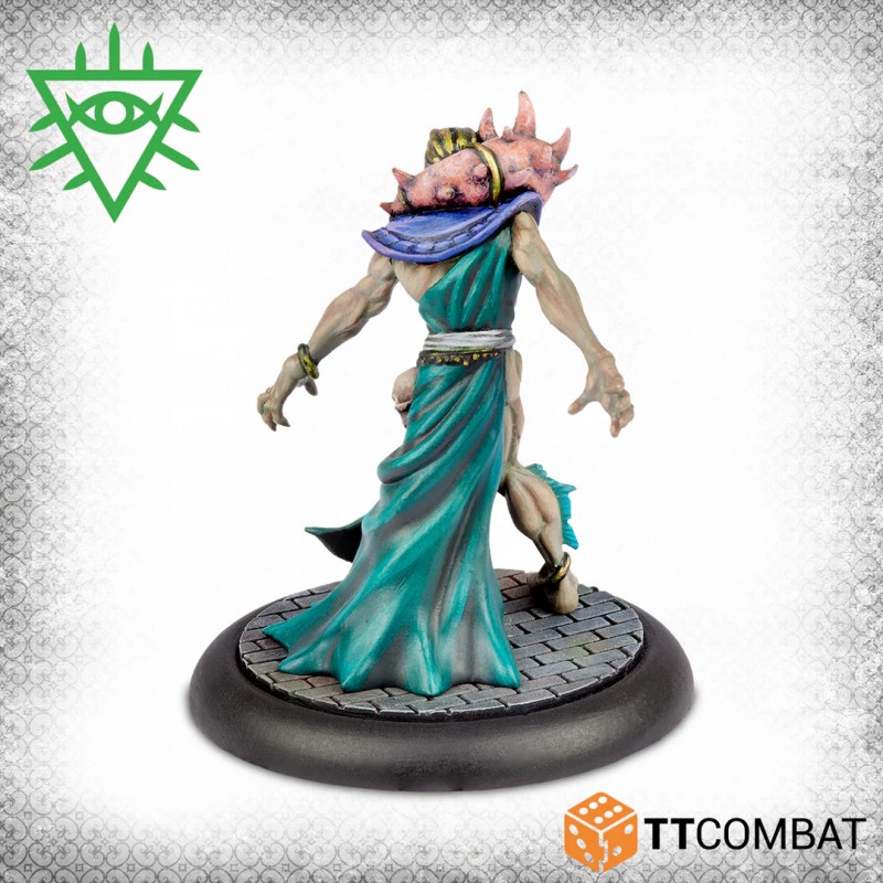 This box provides a complete gang for the Church of Dagon or serves as an expansion for an existing Rashaar force. The Voice of Dagon acts as a powerful support leader, able to influence and control any character. The Dagonite Priest casts a variety of magical spells to aid allies, while the three Dagon Acolytes supply the Rashaar with competent ground fighters, balancing strategy and supernatural power in every game.