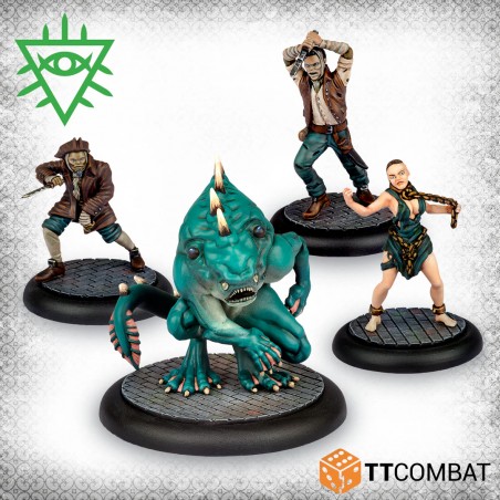 The kit includes 4 resin figures and 4 plastic bases. Illustrated stone bases are not included. The figures are supplied unpainted and unassembled. This kit requires cleaning and assembly, and small holes may need filling. Perfect for collectors or to complete a diorama, this set captures the dark and supernatural atmosphere of the Church of Dagon.