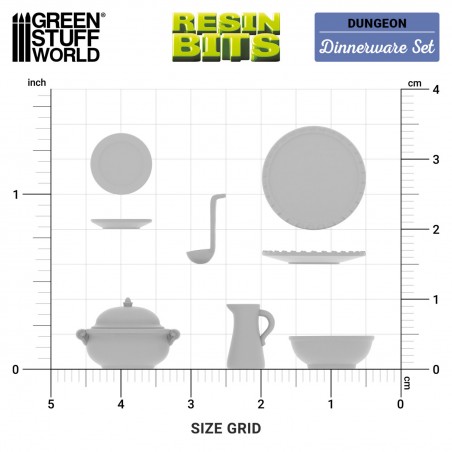 The set is supplied unpainted, ready to be cleaned, primed, and painted with your usual methods. It is compatible with 1:48 and 1:35 scales, common standards in wargames and miniature gaming. Each box includes 34 varied pieces: plates in several sizes, bowls, a jug, a soup tureen with its ladle, a salad bowl, and large serving dishes. A must-have for hobbyists and game masters who want to add realism and atmosphere to their terrain and scenes.