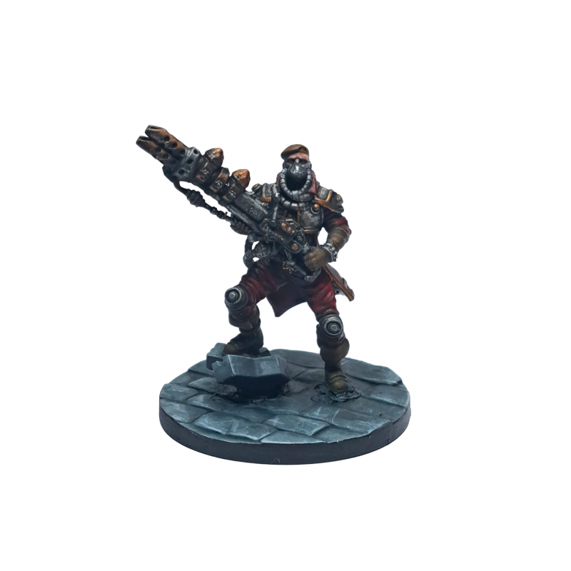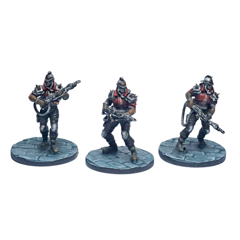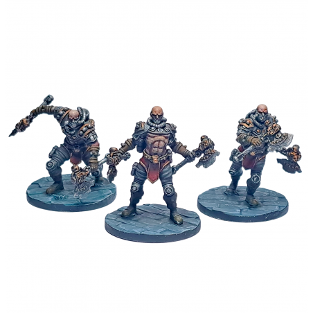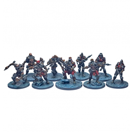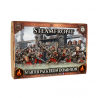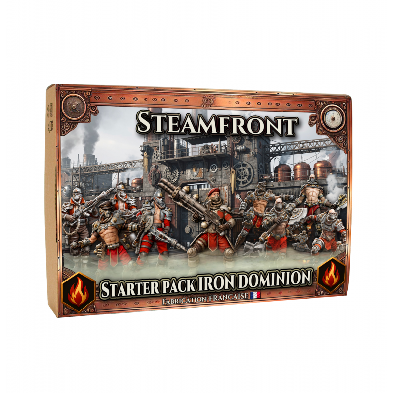 This Iron Dominion starter is perfect for new players. It includes 9 3D-printed miniatures with 9 textured bases, along with the rules, profile cards, and all the tokens, dice, and markers needed to play. The miniatures included are: 1 Ghorza Firemaster, 2 Cadrefer, 3 Ignifer, and 3 Hurlefer. A free three-scenario mini-campaign following the rise of Ghorza Firemaster is also available for download on the Steamfront Universe website.