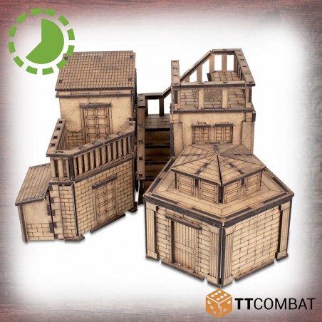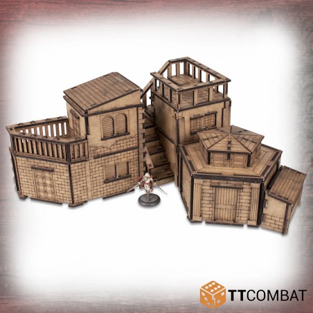 Calle de la Riva est un magnifique ensemble de trois bâtiments offrant de nombreuses possibilités pour le jeu sur table. Avec des hauteurs variées, ces bâtiments permettent aux figurines de Carnevale de les escalader facilement lorsqu'ils sont utilisés ensemble. Ils peuvent également être placés séparément sur le plateau pour des configurations plus dynamiques.