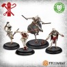 The set includes 4 resin miniatures and 4 plastic bases. The stone bases shown are not included. The resin miniatures are supplied unpainted and unassembled. This kit requires cleaning and assembly and may need some small gaps to be filled. It provides a dynamic and expressive gang ready to unleash chaos on the battlefield.