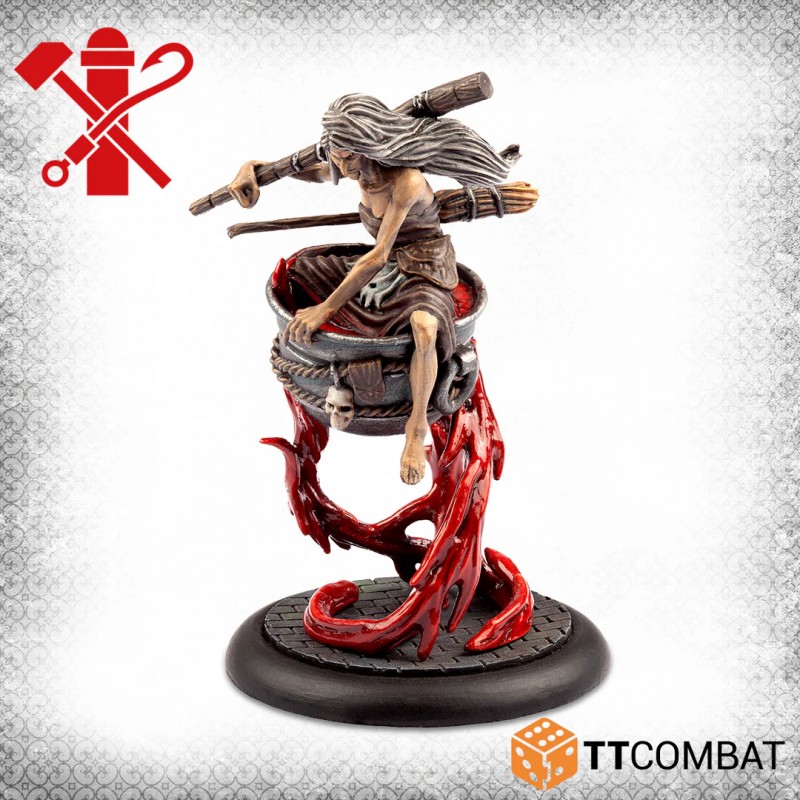 This set contains Baba-Yaga, the Guild’s first response to the use of magic in Carnevale. Floating into battle on spirals of blood, her magical abilities are formidable. With the Blood Rights ability, she claims the blood of other gang members as her own, using it to restore her Will points. And if her magic fails to stop her enemies, her enormous mortar ensures they don’t escape. This kit contains 1 resin miniature and 1 plastic base. The illustrated stone base is not included. The miniatures are supplied unpainted and unassembled. The kit requires cleaning and assembly, and may need some small gaps filled.