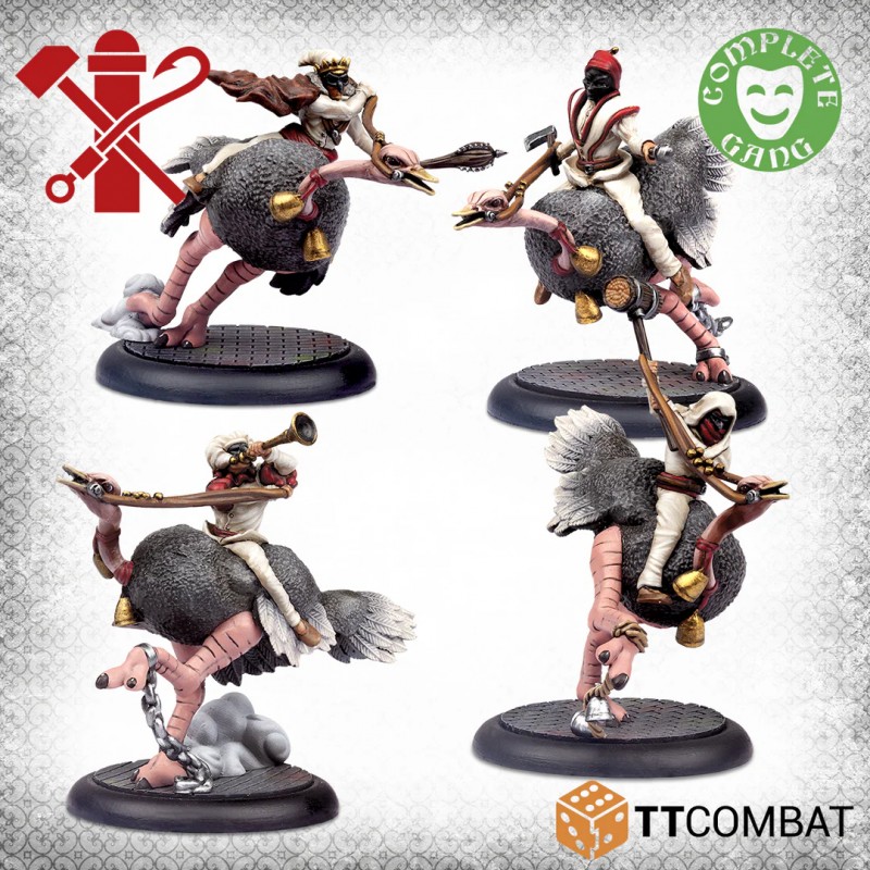 This box features four Pulcinella riding ostriches and effectively forms a complete, fully playable gang. It includes two Ostrich Riders acting as fast Henchmen, ideal for swift battlefield movement. The Very Loud Ostrich, known for its powerful striking attack, serves as a supporting Hero and adds tactical flexibility. Leading the group is the Royal Ostrich, taking the role of Chief and commanding this unusual crew with flair. The set integrates easily into an existing collection while delivering a uniquely eccentric style.