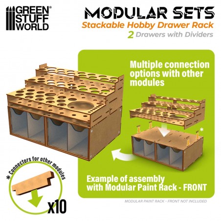 Keep your workspace perfectly organized with this stackable and magnetic modular storage unit, designed specifically for miniature painters, modelers, and hobby enthusiasts. Made from natural MDF and precision laser-cut, this module features clean edges and a precise fit for a sturdy and reliable structure. Its modular design allows seamless integration with other compatible units from the same range, enabling you to build a flexible and expandable storage system tailored to your workflow. Whether you store paints, tools, brushes, or accessories, this unit helps maintain a clean, efficient, and professional hobby environment.