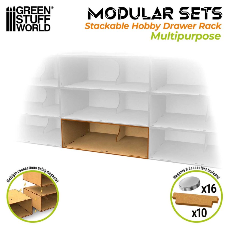 Supplied as a kit, this module requires assembly using white glue for the MDF parts and cyanoacrylate glue for the magnets (glues not included). Before assembly, the wood can be customized with varnishes or stains to enhance durability and match your personal workspace style. This adaptability makes it an excellent choice for hobbyists seeking a practical, scalable, and visually cohesive storage solution that evolves alongside their creative needs.