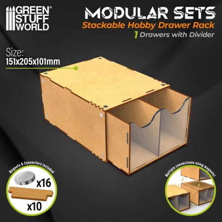 Enhance your hobby workspace with this stackable and magnetized natural MDF storage module, designed for miniature painters, modelers, and creative enthusiasts. Precision laser-cut components ensure clean edges and a perfect fit, resulting in a durable and reliable assembly. Fully compatible with other units in the same modular range, this module allows you to build a flexible and expandable organization system tailored to your paints, tools, and hobby supplies, easily adapting to changes in your workspace layout.