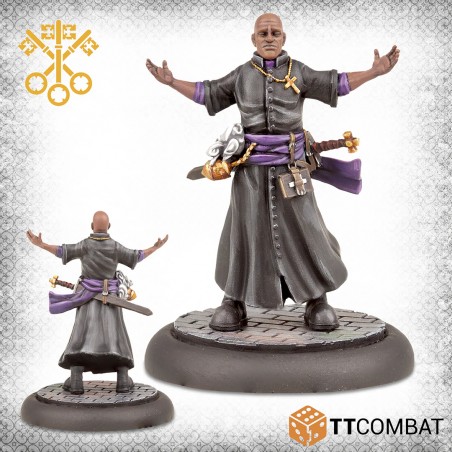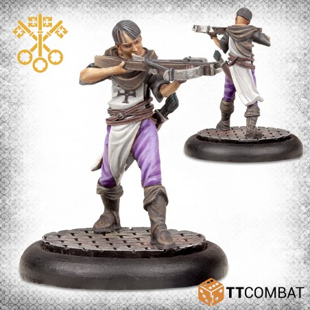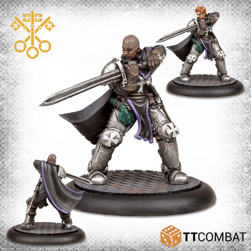 This box provides sacred reinforcements for your Vatican gang. The Templar acts as a versatile hero, capable of dealing damage both at range and in close combat. He is accompanied by a Venator of Devotion, a faithful warrior armed with a Zweihander greatsword, able to take down the largest foes. The conventual chaplain brings prayer and guidance to the streets of Venice, allowing friendly soldiers to follow the path through his psychic communion. These knights are supported by their loyal Maltese squire and reliquary page, ready to assist their masters in every aspect of battle.