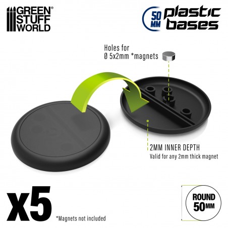 These 50 mm round plastic bases with rounded edges are designed for larger miniatures used in modeling, wargaming, role-playing games, and miniature collections. Their generous diameter provides a stable and balanced platform, making them ideal for large characters, massive creatures, or command models that require more space for scenic basing.