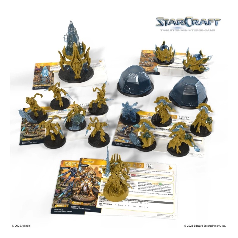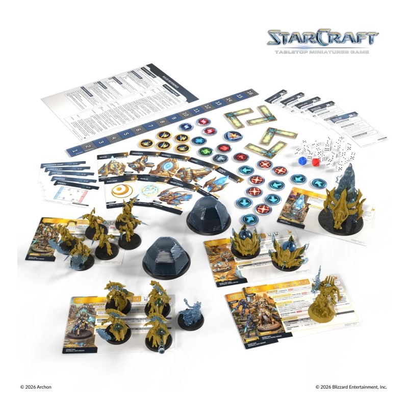 All miniatures are supplied unassembled and unpainted, giving hobbyists the freedom to customise their Protoss forces. The set also includes bases of various sizes, tactical cards, dice, tokens, a measuring tool, an assembly manual, and a rule reference guide, providing everything needed to dive into the strategic battles of the StarCraft universe.