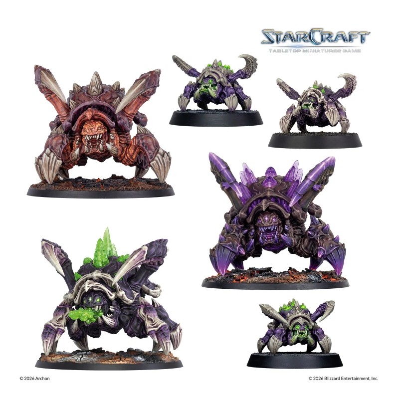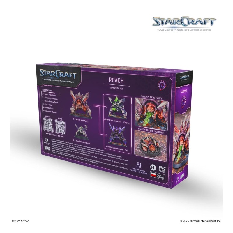The set contains 3 Roach miniatures, 3 Roachling miniatures, 32 mm and 50 mm bases, 5 cards, and an assembly manual to integrate these units into your StarCraft tabletop games. All miniatures are supplied unassembled and unpainted, ready for hobbyists to customize and paint.