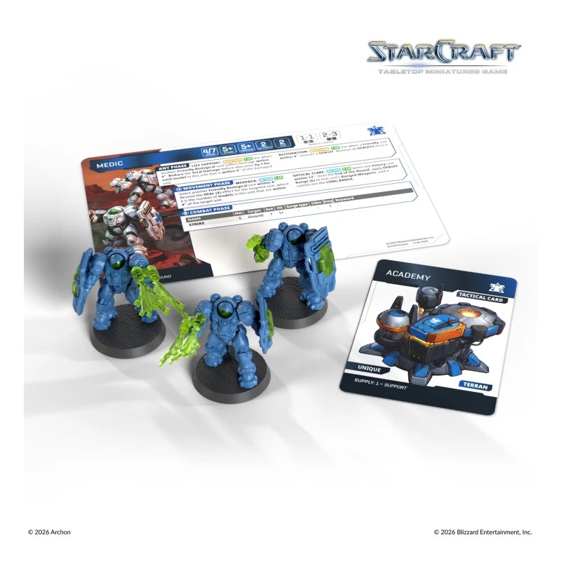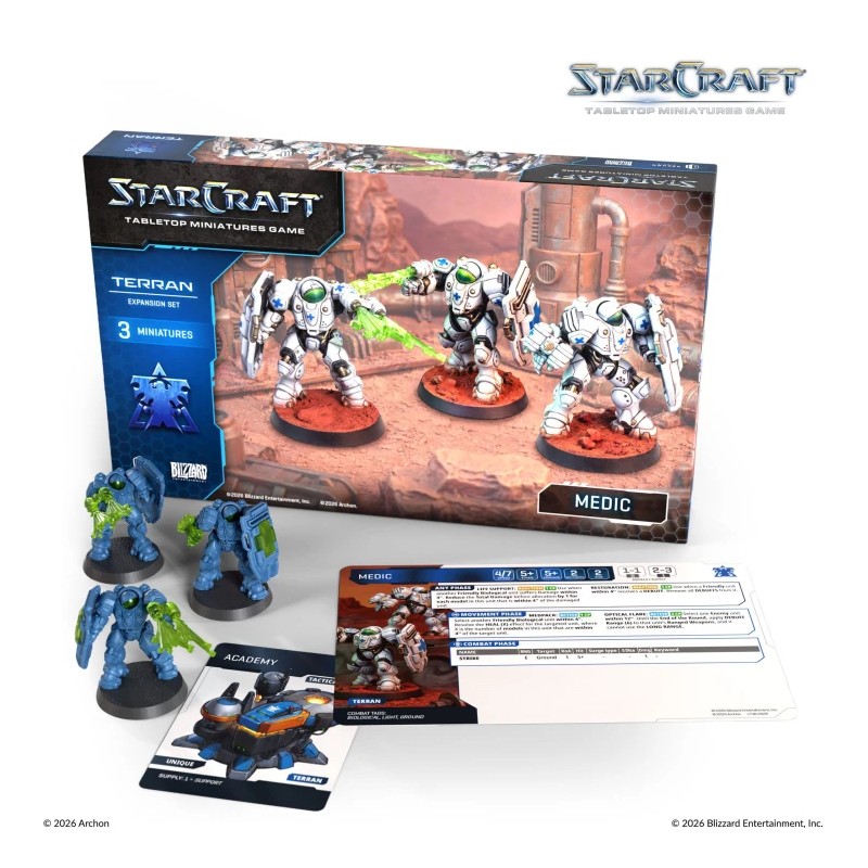 This box includes 3 detailed Medic miniatures with 32 mm bases, 2 unit cards, and an assembly manual to integrate these units into your StarCraft tabletop games. All miniatures are supplied unassembled and unpainted, ready for hobbyists to customize and paint.