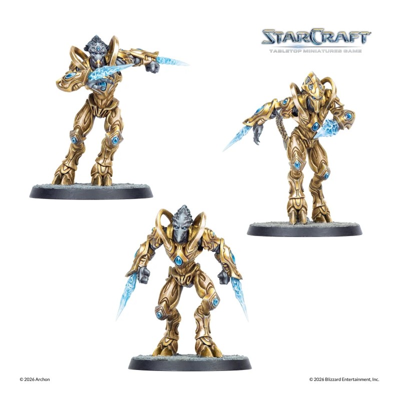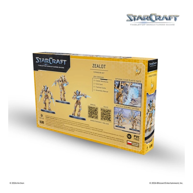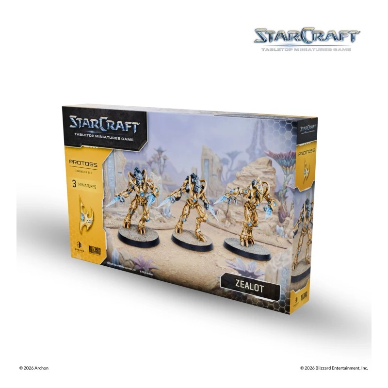 On the tabletop, Zealots represent the strength and zeal of Protoss armies. The kit includes 3 Zealot miniatures with 40 mm bases, 3 unit cards, and an assembly manual. All miniatures are supplied unassembled and unpainted, ready for hobbyists to customize and paint.