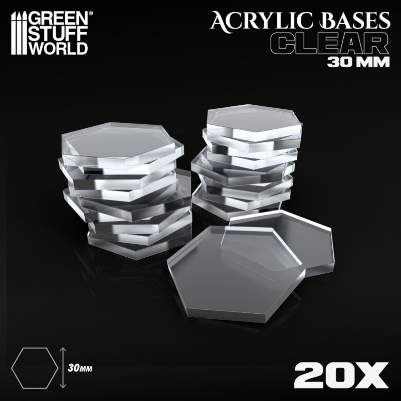 Choose a modern look with 30 mm hexagonal acrylic bases. These transparent bases are ideal for modelling, wargames, RPGs, and miniatures, offering a clean finish that highlights your models.