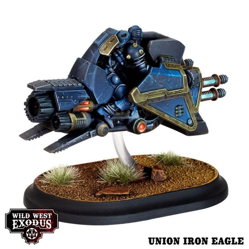 The Union Iron Eagle represents the peak of Iron Horse technological evolution, featuring a voltaic engine, reinforced armor, and advanced electro-weaponry. Programmed to be piloted by Nikolai Tesla’s UR-31E Automata, the Iron Eagle offers unmatched resilience and battlefield performance. This kit contains 2 Iron Horses, each of which can also be built as a Blazer or Union Iron Eagle, including riders for Enlightened, Union, Outlaws, Hex, and Lawmen. Miniatures are supplied unpainted and require assembly. Character Unit Cards are available separately from the official Wild West Exodus website.
