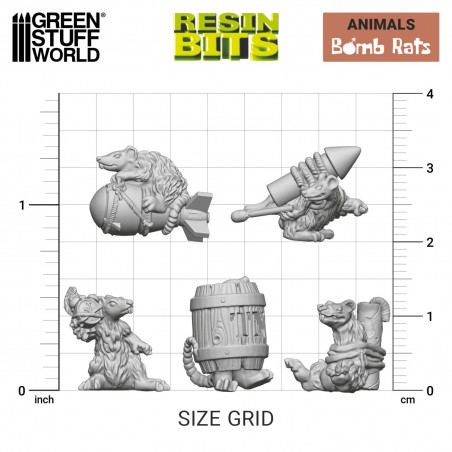 Made from high-quality resin, these bomb rats feature a solid level of detail and a finish suited for miniature modelling. Each piece is carefully designed with varied shapes to ensure easy integration into different compositions. Supplied unpainted, they offer full freedom for customization according to your painting style and preferences. Designed for 1:48 scale, they are compatible with a wide range of miniature systems and diorama projects.