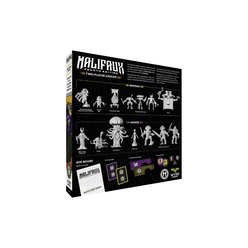 Please note: miniatures are supplied unpainted and may require assembly. Printed materials are provided in English. This set is a complete starter box for Malifaux Fourth Edition, providing everything needed to begin play immediately, including multiple crews, game accessories, and a wide variety of miniatures from the Outcasts and other independent forces.