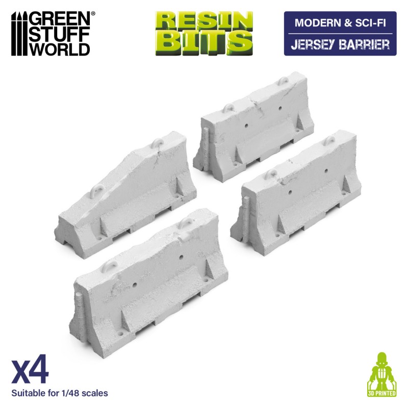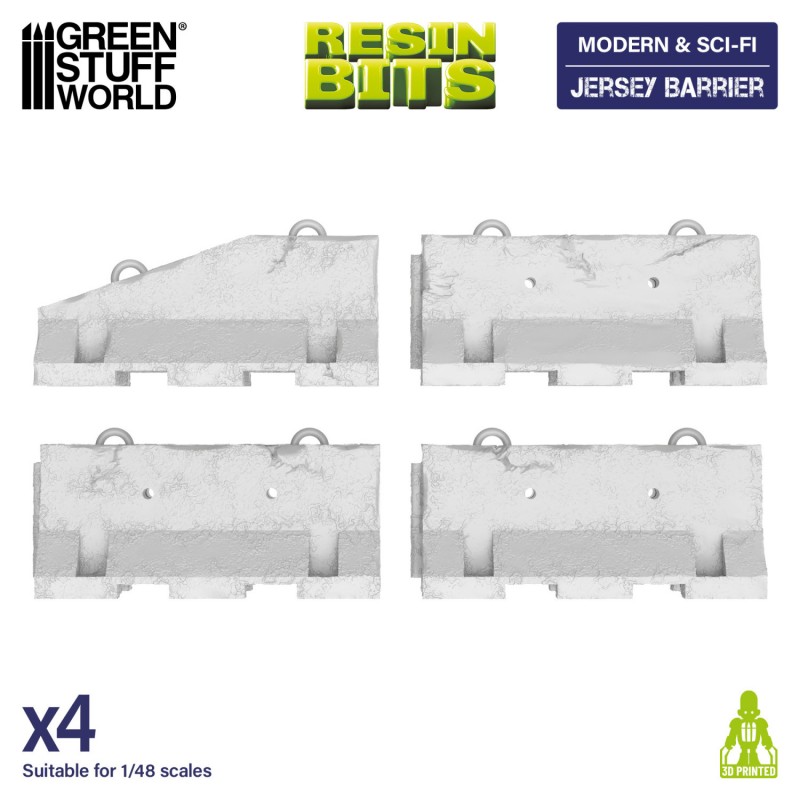 Jersey barriers take their name from their original use in the state of New Jersey, where they were first installed to separate highway lanes and significantly reduce traffic accidents. Today, they are widely used across the world as standard infrastructure elements in urban and industrial environments. This set represents the standard version of these barriers, making them ideal for depicting roads, construction sites, industrial zones, or contemporary cityscapes. Their simple yet iconic design makes them excellent tools for shaping battlefield layouts, controlling lines of sight, and guiding unit movement.