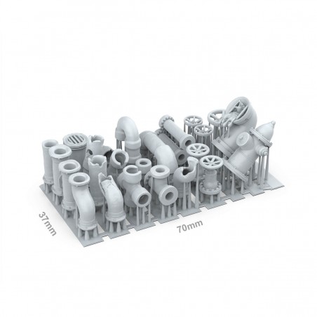 Bring a technical and industrial edge to your bases and scenery with this set of miniature pipes and fittings. Designed in highly detailed 3D-printed resin, these components allow you to structure and enrich your scenes by adding realistic and visually engaging piping systems. Ideal for hobbyists seeking a high level of realism, this kit provides an easy and effective way to transform simple terrain into detailed, narrative-rich environments.
