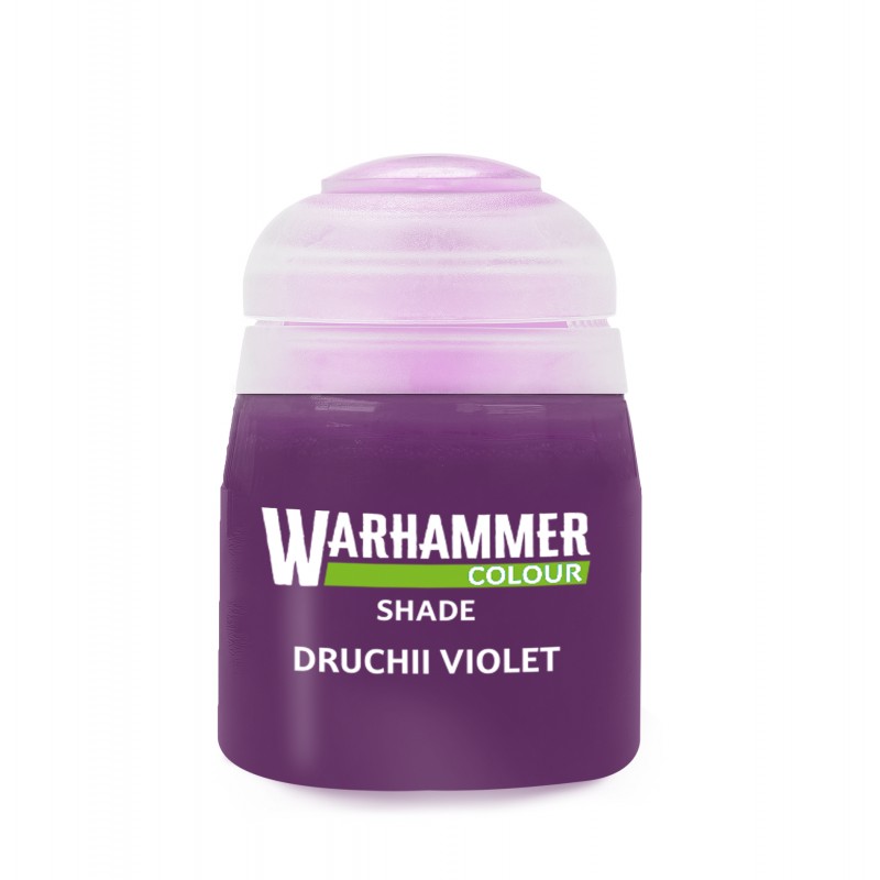 The Druchii Violet is a Shade paint designed to add deep, natural-looking shadows that instantly enhance miniature details. Its fluid formulation flows into recesses and sculpted areas, improving volume definition while adding a rich, slightly purple-toned depth to painted surfaces. It is especially well suited for dark armour, noble fabrics, fantasy skin tones, or elements requiring a coloured and contrasting shading effect.