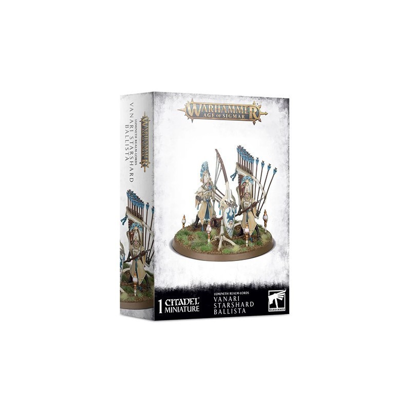 Made from supple, yet extremely strong dreamwood, the Vanari Starshard Ballistas are the premier artillery piece of the Lumineth Realm-lords. Firing a pair of long, perfectly balanced bolts in unison, the brilliant flash of light that accompanies their impact dazzles and disorients all those who the razor-sharp points don't kill outright.