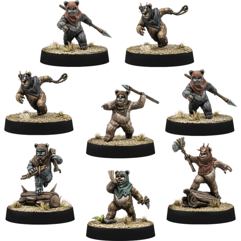 In this box, you'll find 8 plastic figurines to paint and assemble, offering 6 different models of Ewoks, plus 2 Unit cards, 5 Upgrade cards, 1 counter sheet and 1 instruction leaflet.