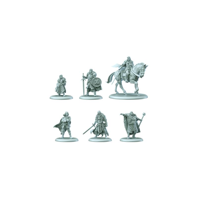 This box includes 6 major House Stark figures: Eddard Stark, the King's Hand (with his head intact), Robb Stark, King in the North, Lyanna Mormont, the young lioness, Maege Mormont, the Lady of Bear Island, Rickard Karstark, Lord of Karhold, and Brynden Tully, the Vanguard scout.