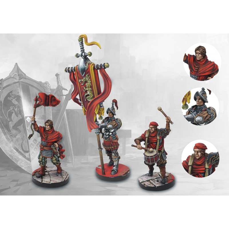 By marching alongside the rulers of the Hundred Kingdoms, Tactical Retinues allow their accompanying characters (notably Imperial Officers, but also Noble Lords and Chapter Mages) to extend their control and command of the troops at their disposal, ensuring that men are inspired by the presence of the army's standard while its signalman and drummer ensure the united functioning of its army. This kit contains 3 models that can be used to represent the Tactical Retinue 1-3 upgrade in your Hundred Kingdoms characters.