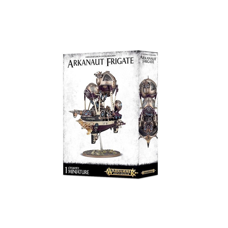 This multi-part plastic kit contains the components necessary to assemble an Arkanaut Frigate. Smaller than an Ironclad, larger than a Gunhauler, it dominates the skies by means of its dirigible and is covered in weaponry – a heavy skycannon or skyhook as a front-facing main weapon, with aethershot carbines, grudgesettler bombs, skymines and detonation drills attached to the hull, with belaying valves for ramming-speed assaults.