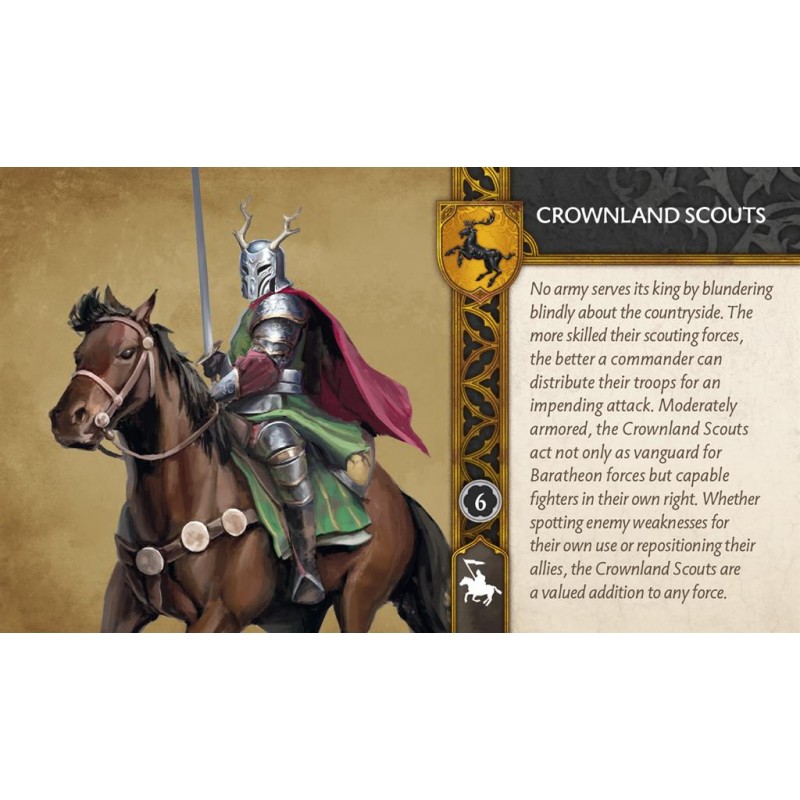 Knowledge is a valuable asset, and having information about enemy movements and formations can win a battle before it even begins. That's why having reliable scouts is so crucial. For House Baratheon, this task is entrusted to the Crownland Scouts cavalry unit.