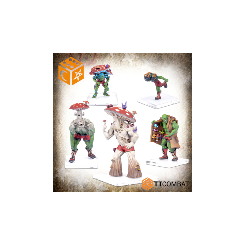 The Toadstool Peddlar is a malevolent orc who delights in selling performance-enhancing mushrooms to boost his allies. But these mushrooms can be fickle, so don't be surprised if things go wrong! The Juicer is an orc who has consumed too many mushrooms, and now the fungus has taken complete control. It's a rabid little mushroom that doesn't care much about defending itself.