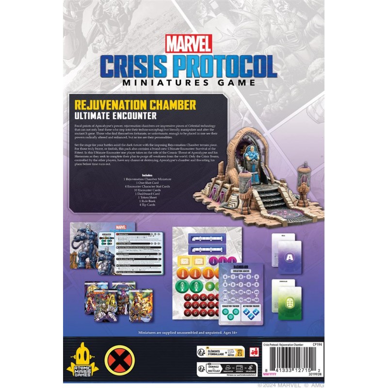 Plongez vos batailles dans un futur sombre avec la pièce imposante de terrain "Chambre de Régénération". Pour les plus courageux ou les plus imprudents, ce pack contient également une nouvelle Rencontre Ultime, "Survival of the Fittest". Dans cette Rencontre Ultime, un joueur incarne la menace cosmique d'Apocalypse et ses Cavaliers, tandis que les autres joueurs contrôlent une équipe qui tentera de détruire la chambre d'Apocalypse et de contrecarrer ses plans avant qu'il ne soit trop tard.