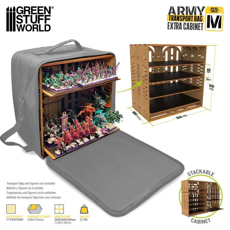 J'en profite !L'Extra Cabinet a été conçu pour améliorer le transport et le stockage de vos miniatures. Il peut servir d'armoire supplémentaire pour le sac de transport GSW Army ou être utilisé comme un système de rangement empilable autonome. Fabriqué en bois MDF, il peut contenir plus de 200 miniatures réparties sur plusieurs niveaux d'étagères.