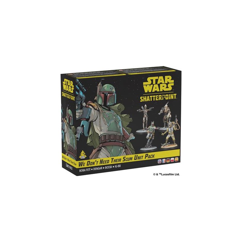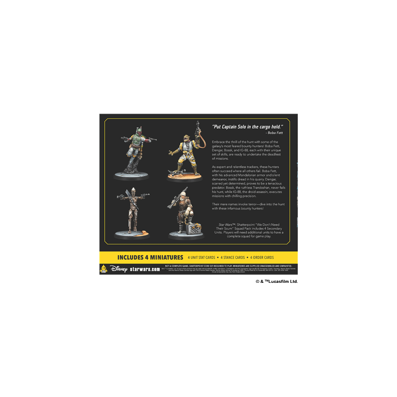 J'en profite !Le pack d'unité We Don’t Need Their Scum introduit les célèbres chasseurs de primes dans Star Wars™: Shatterpoint ! Plongez dans l'excitation de la chasse avec des personnages emblématiques tels que Boba Fett, Bossk, Dengar et IG-88 dans ce tout nouveau pack d'unité.
