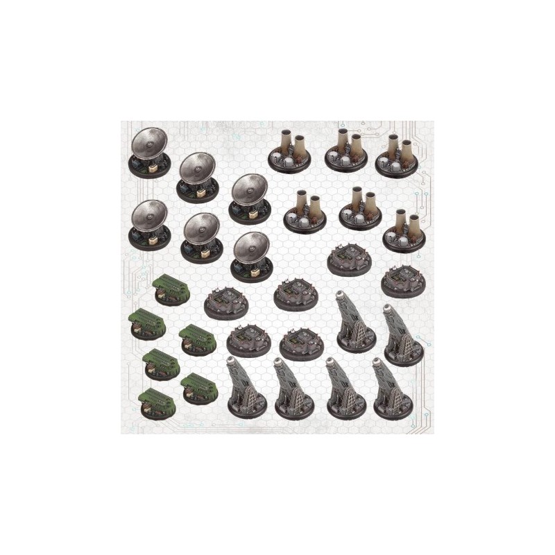 Vous y trouverez 5 types de jetons : avant-poste militaire, canon de défense orbitale, station de communication, centrale électrique et hangar.