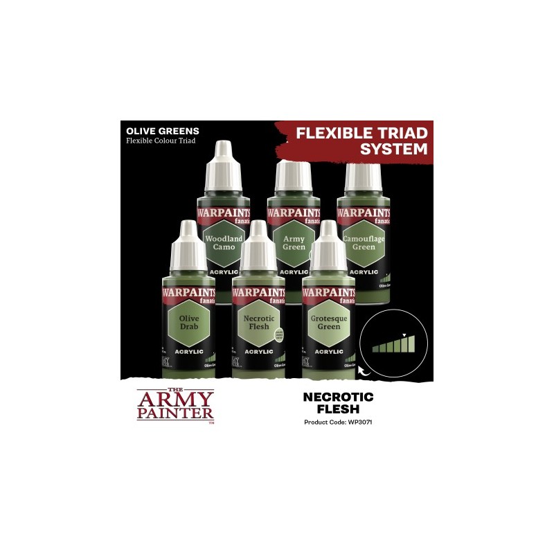 J'en profite !Le Warpaints Fanatic: Necrotic Flesh est un vert olive pâle qui correspond parfaitement aux gammes Warpaint Air et Colour Primer portant le même nom. Il s'agit de la deuxième teinte la plus claire de la triade de couleurs flexibles "Olive Greens". Son nom pratique est "Olive Pâle".
