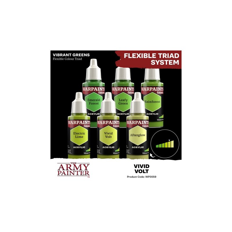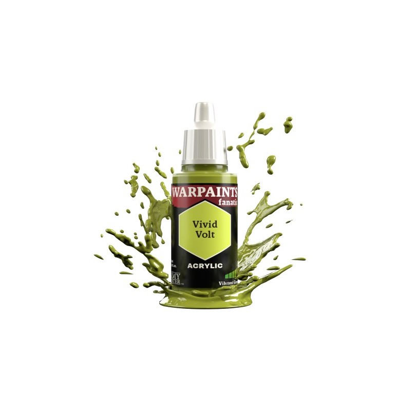 J'en profite !The Warpaints Fanatic: Vivid Volt est un jaune-vert brillant, idéal comme couleur de couche ou de surlignage pour les verts éclatants. C'est la deuxième teinte la plus claire de la triade de couleurs flexibles "Vibrant Greens". Son nom pratique est "Jaune-Vert Brillant".
